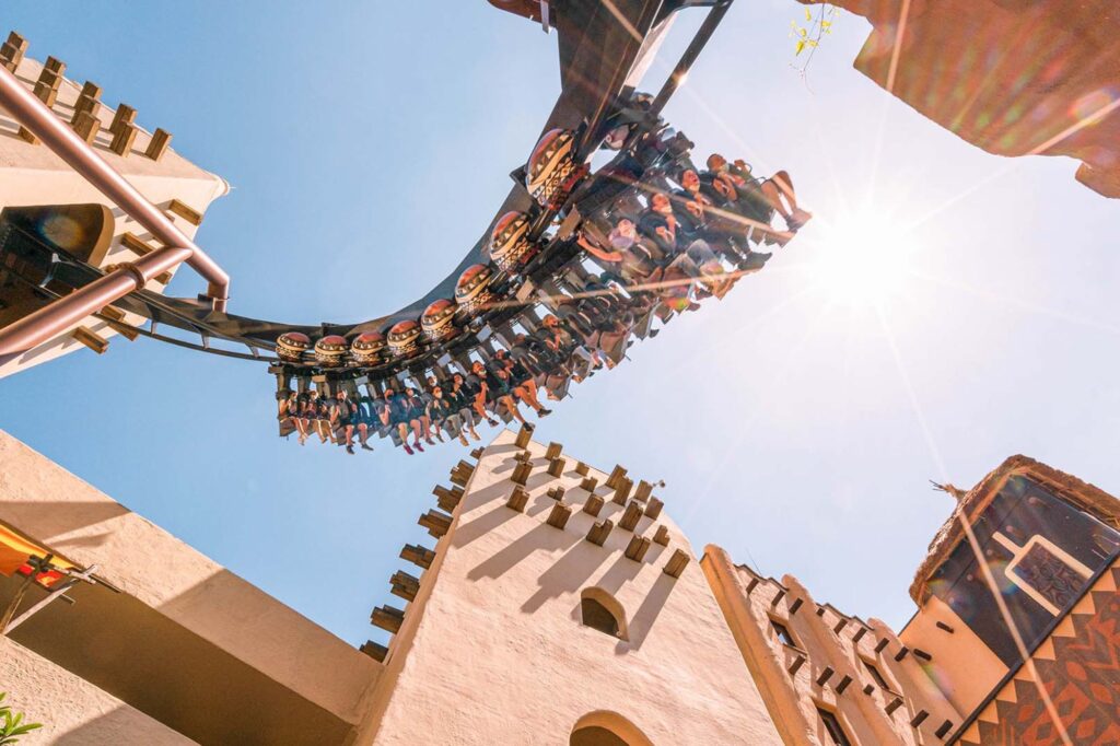 De achtbaan Taron slingert met een waanzinnige behendigheid tussen de huizen door, terwijl F.L.Y. je in een liggende positie over de daken laat vliegen als een mechanische vogel.